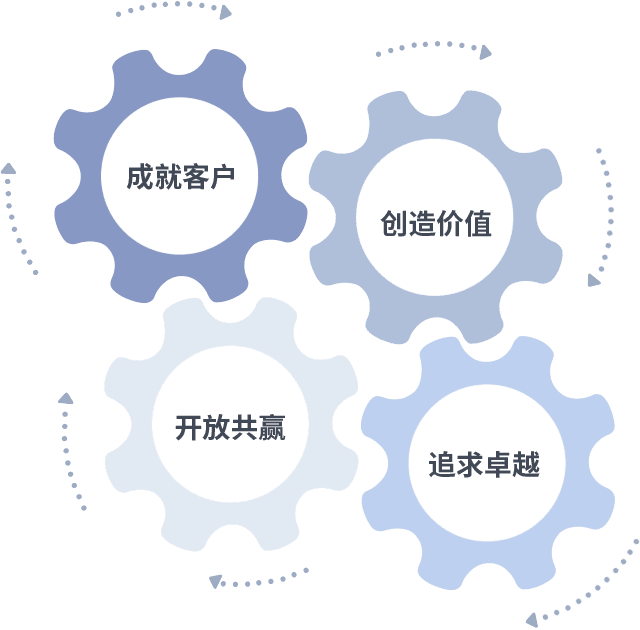 成就客户是一切决策的出发点,,,创造价值是衡量所有工作的标准,,,,追求卓越是我们做事做人的态度,,开放共赢是我们的格局也是最终的结果。。。价值观的齿轮环环相扣,,推动着组织里的每个人不断向前。。。。